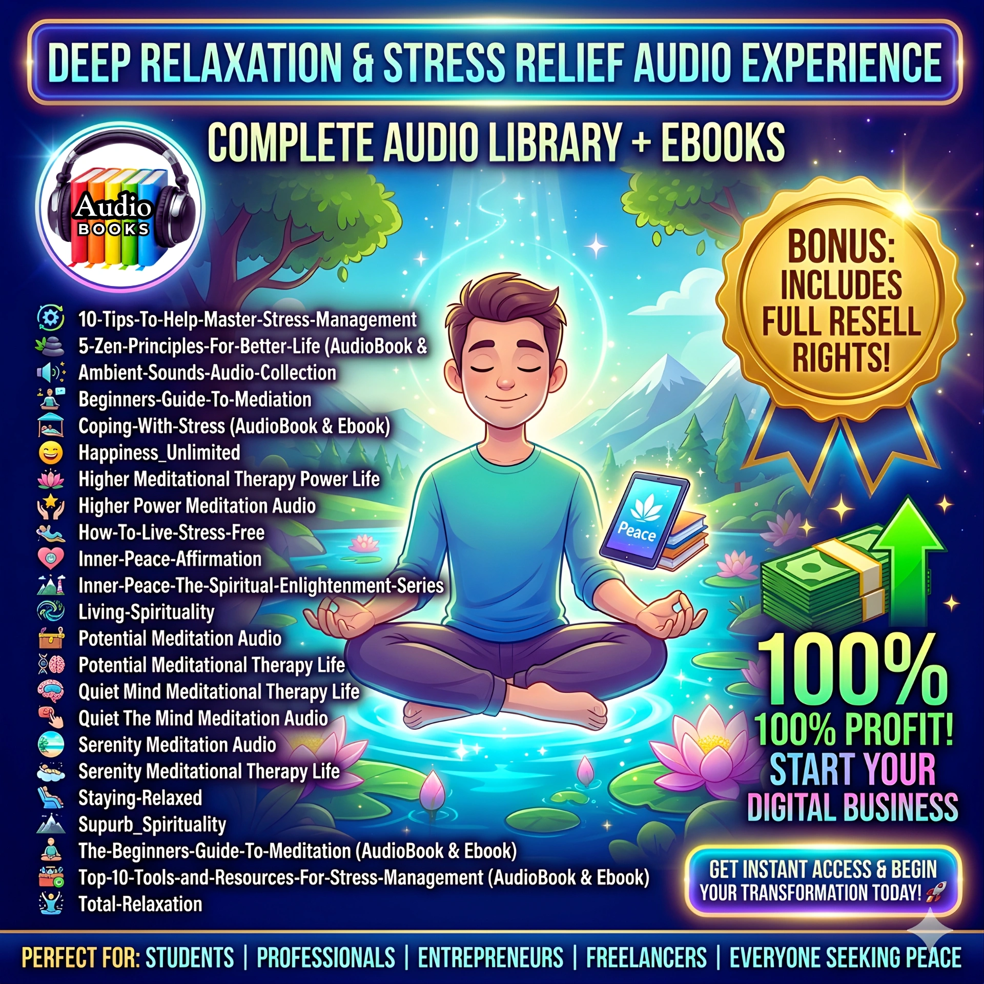 The Deep Relaxation & Stress Relief Audio Experience is a massive, curated collection of 23 transformation tools designed to help you decompress, meditate, and master the art of living stress-free. Whether you are a beginner or a seasoned practitioner, this library is your ultimate sanctuary.